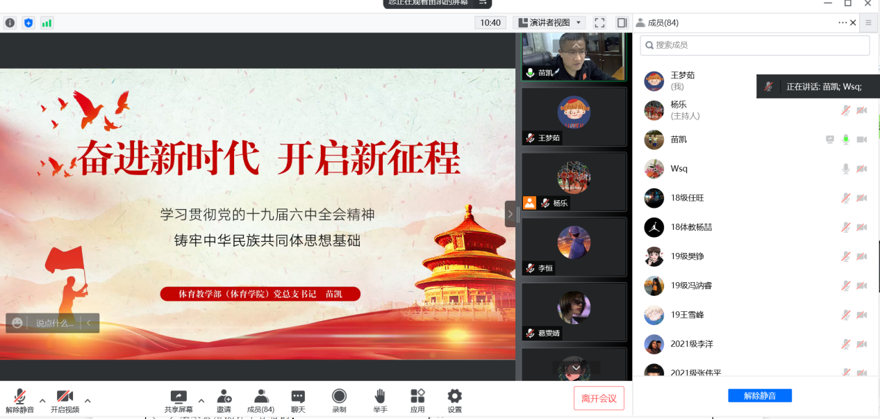 会议开始,党总支书记苗凯为全体同学做了题为《奋进新时代 开启新征程》专题党课,从深刻认识党的十九届六中全会的重大意义、深刻认识党的百年奋斗的历史性成就和历史变革、深刻认识党的百年奋斗的历史意义和历史经验、深刻认识以史为鉴、开创未来的重要要求、学习习近平总书记在内蒙古代表团审议时的重要讲话精神五个方面,对党的十九届六中全会精神及习近平总书记重要讲话精神进行了深刻解读和阐释,此次党课内容丰富、重点突出,具有很强的理论性、实践性和指导性。