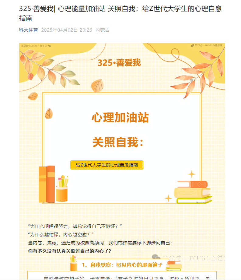 活动期间,学院微信公众号通过推送心理健康科普专题文章,聚焦情绪管理、压力应对、人际交往及自我认知等大学生常见议题。内容以趣味案例与通俗语言相结合,让心理学知识“活起来”,帮助学生在轻松阅读中掌握实用心理技巧。