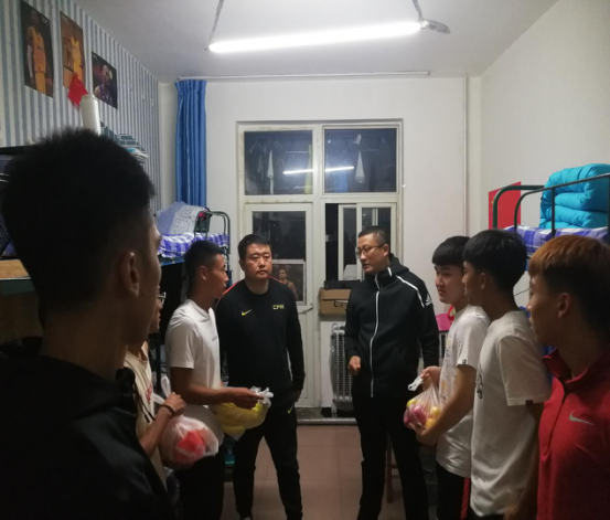 庆祝国庆,欢度中秋。2020年9月30日,体育教学部(足球学院)副主任(副院长)苗凯、体育教育系主任王丰、团总支书记闫智惠、2019级班主任杨乐等人到体育教育专业学生宿舍开展“送关爱,送温暖”中秋国庆节日慰问活动。