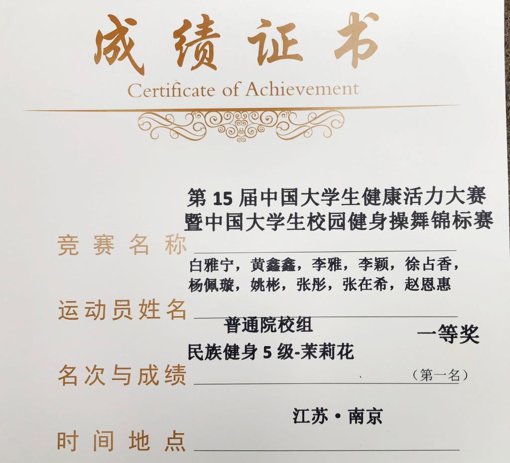 伟德国际1946官方网10名运动员组成的代表队参加了普通院校组民族健身规定动作项目的比赛。赛场上,每位运动员凝心聚力、全力以赴,将最好的状态和最高的水平展现了出来。在体育教学部(足球学院)李萍、张巨荣、闫智惠三位教练员指导下,最终荣获参赛项目第一名的优异成绩。在备赛的一个多月来,每位运动员都积极向上、坚持不懈、不畏困难,教练员们悉心教导,精益求精,为本次比赛的胜利奠定了基础。