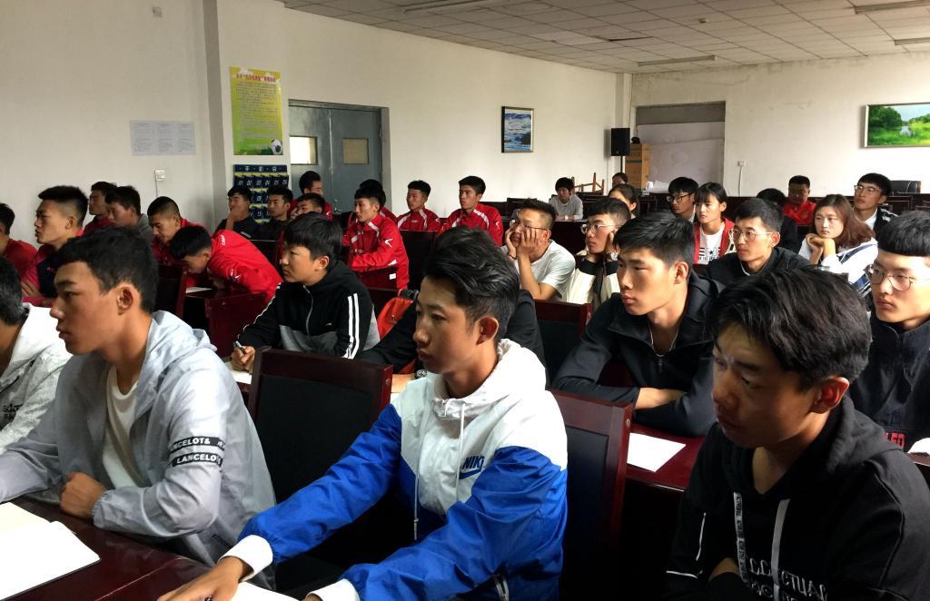 为贯彻落实党的十九大精神,深刻领会习近平新时代中国特色社会主义思想和基本方略,切实提高广大青年党员、团员的政治素养, 9月14日上午8:30,体育教学部(足球学院)党总支书记、院长田瑞峰在体育馆二楼多媒体教室作了关于“习近平新时代中国特色社会主义思想和基本方略”的专题学习讲座,体育教育专业(足球方向)学生认真聆听,积极学习。