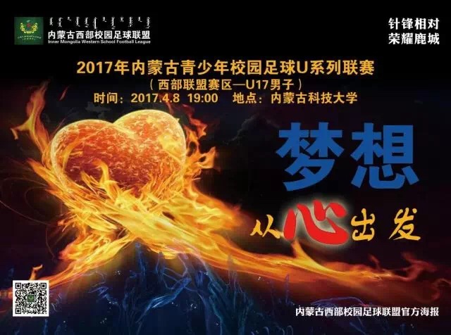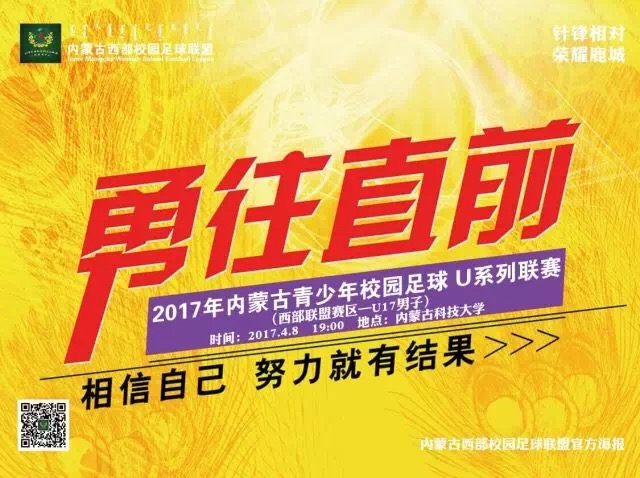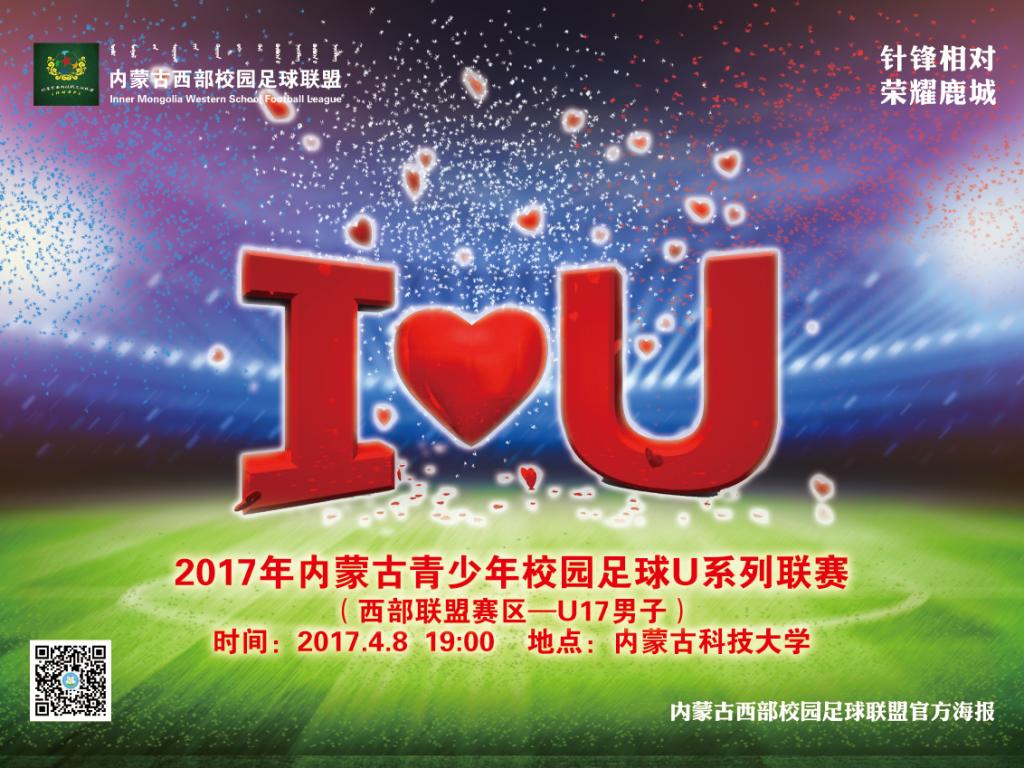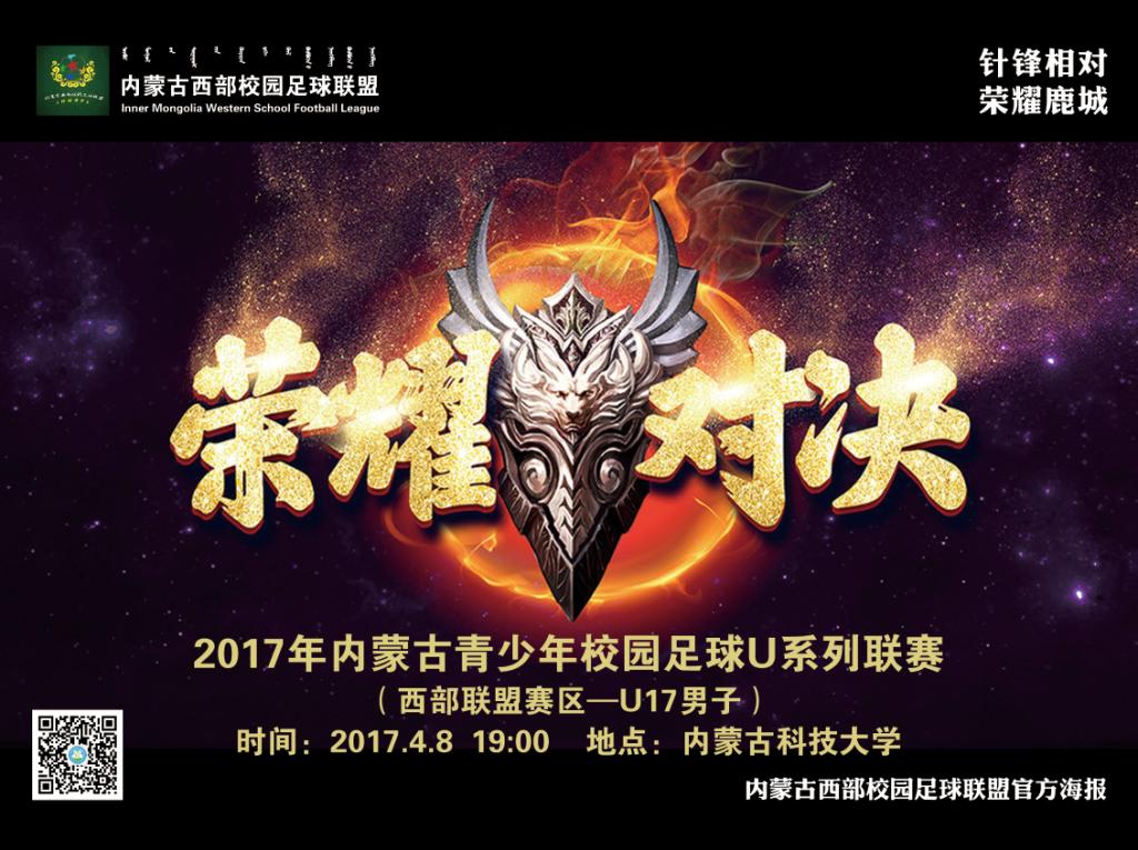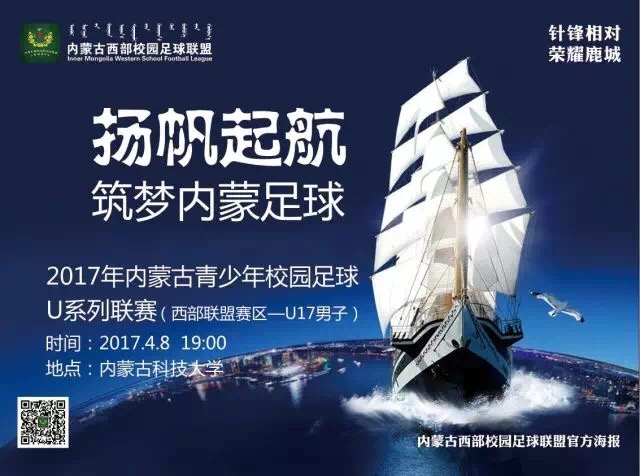 4月8日19:00分,2017年内蒙古自治区校园足球“西部联盟杯”校园足球联赛(U17男子组)揭幕战将在伟德国际1946官方网主校区体育场举行,对阵双方由包头市主场迎战巴彦淖尔市。本次比赛由内蒙古自治区校园足球工作领导小组办公室主办,内蒙古西部校园足球联盟、包头市教育局、乌海市教育局、巴彦淖尔市教育局、阿拉善盟教体局承办,内蒙古自治区中学生体育协会、内蒙古校园足球联合会协办。