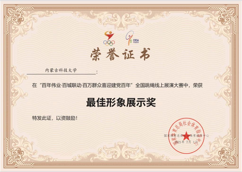 2021年7月,为热烈庆祝党的百年华诞,学校组织参加“百年伟业·百城联动·百万群众喜迎建党百年”全国跳绳线上展演大赛,引导学生通过跳绳锻炼,抒发爱党爱国之情,最终获得了最佳形象展示奖。