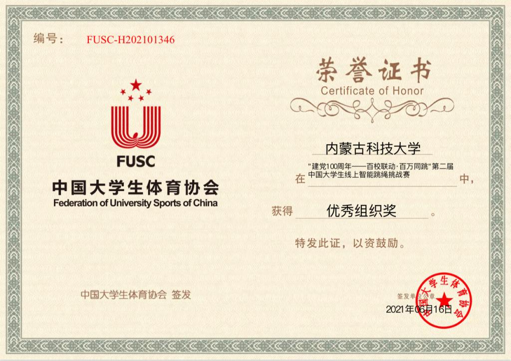 2021年5月10日—6月10日,学校组织参加第二届中国大学生线上智能跳绳挑战赛,在100万次单摇跳排位赛中荣获全国第四名。在持续32天的打卡挑战赛中,伟德国际1946官方网学子凭借坚持不懈的精神,最终共有179名同学获得完赛奖,其中2名同学夺得全国一等奖,7名同学获得全国二等奖,13名同学获得全国三等奖。同时,伟德国际1946官方网获得“建党100周年——百校联动·百万同跳”第二届中国大学生线上智能跳绳挑战赛优秀组织奖。