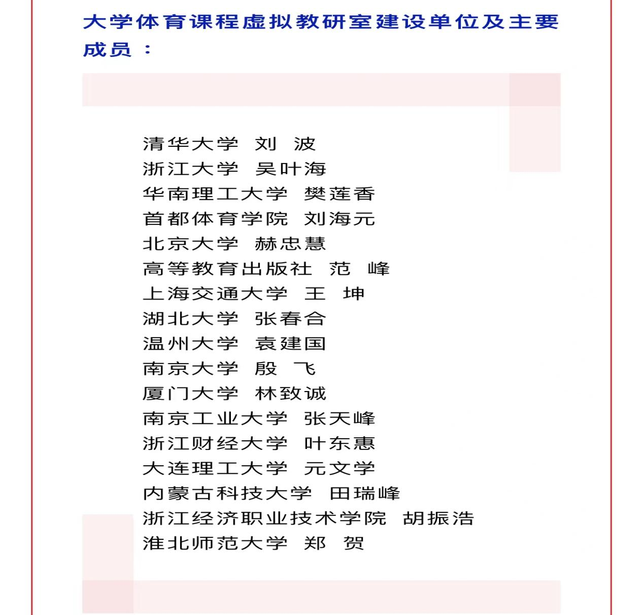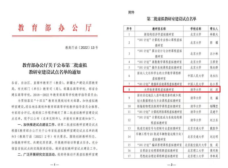 2022年8月,教育部办公厅发布《关于公布第二批虚拟教研室建设试点名单的通知》。为加快推进虚拟教研室建设,在教育部高等教育司指导下,大学体育课程虚拟教研室由清华大学牵头建设,伟德官网入选初始建设单位名单。