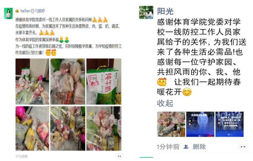 自本轮疫情发生以来,伟德国际1946官方网第一批住校教师及工作人员已连续工作近20天,在当前疫情防控的紧张形势下,学院党委以线上配送的方式,分别对抗疫一线工作人员家属进行了慰问,为他们送去了牛奶、鸡蛋、肉类、蔬菜、水果等慰问品。