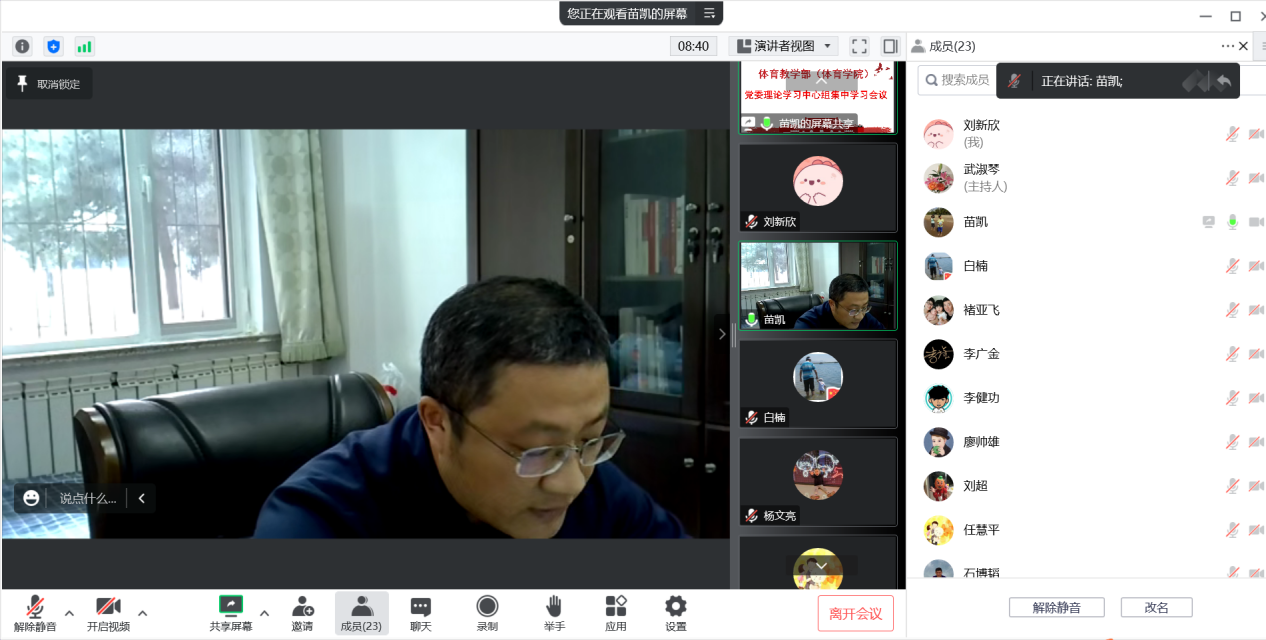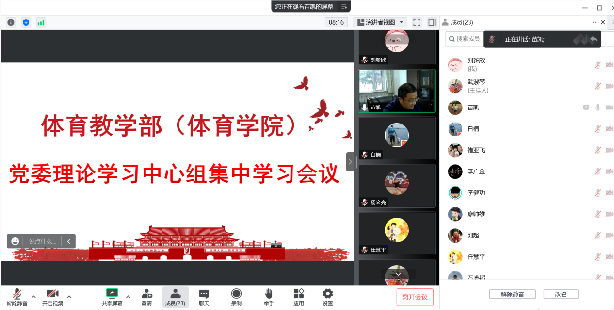 会议第二项,深入学习领会习近平总书记关于坚持自我革命、全面从严治党的重要论述。首先,苗凯领学《习近平:党找到了自我革命这一跳出治乱兴衰历史周期率的第二个答案》。随后,学院党委委员苗凯、白楠、武淑琴、张新民、杨文亮围绕学习主题依次进行了研讨发言。