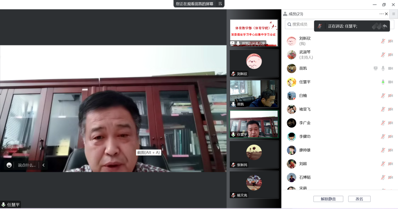 学习结束后,任慧平校长做了点评,他表示,此次学习会议以学习宣传贯彻党的二十大精神为主线,学院各位党委委员紧密联系工作实际,从不同角度进行了研讨发言,体现了高度的思想自觉、坚定的政治立场、强烈的使命担当,达到了预期的学习目的和效果。同时希望在未来的工作中,伟德国际1946官方网要立足学校发展实际,全面贯彻党的教育方针,发挥学院专业优势,着力推进高水平运动队建设,开展阳光体育运动,推动校园体育文化建设,着力培养学生具备良好的身体素质和运动技能,牢固树立爱国主义观念和拼搏进取精神,不断为培养德智体美劳全面发展的社会主义建设者和接班人而努力奋斗。