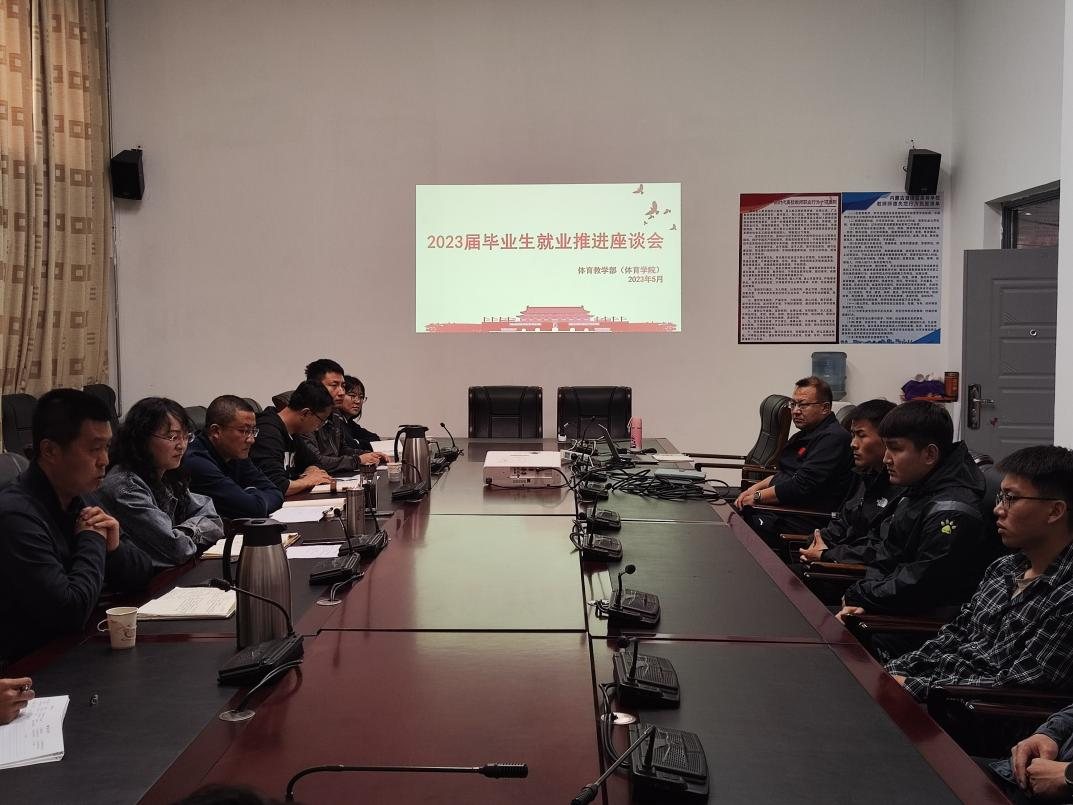 2023年5月5日,伟德国际1946官方网在体育馆二楼会议室组织召开2023届毕业生就业推进座谈会,伟德国际1946官方网党委书记苗凯、院长白楠、党委副书记武淑琴、副院长张新民、学工办主任杨乐、团总支负责人王梦茹,招生就业处职业发展与就业指导中心主任高玉峰、就业信息中心王宇、就业信息中心贺凌飞以及2023届体育教育专业毕业生参加座谈会。