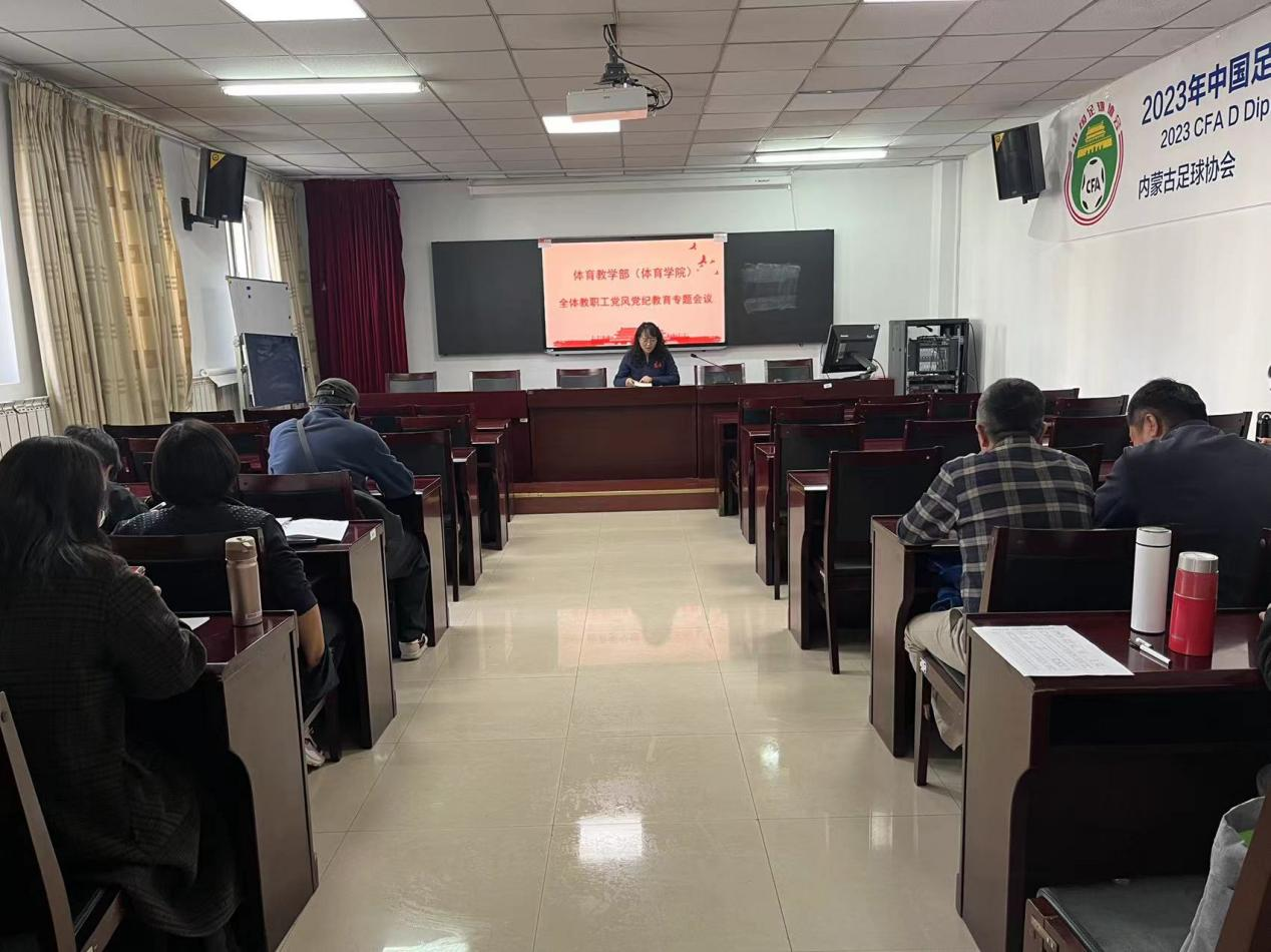 2023年11月2日,伟德国际1946官方网在体育馆二楼多媒体教室组织召开全体教职工党风党纪教育专题会议,会议由学院党委副书记武淑琴主持。