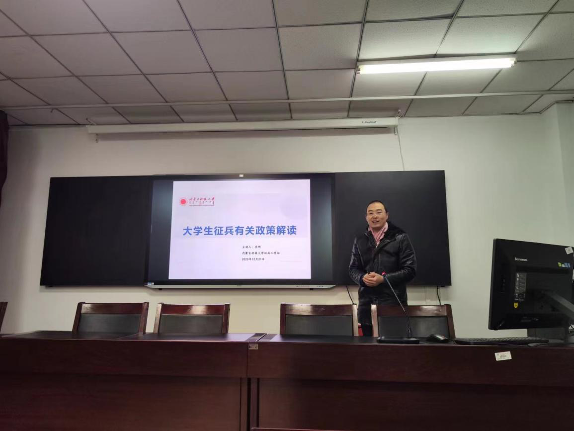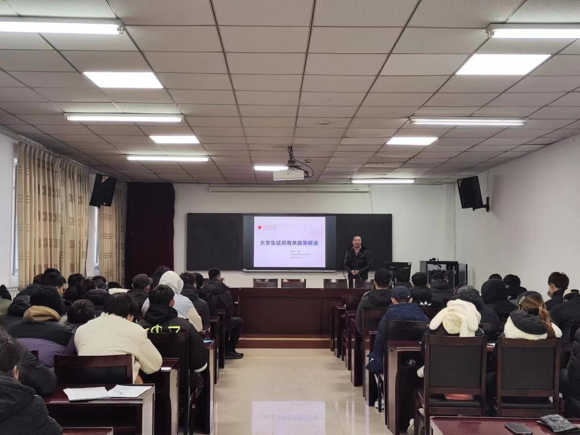 2023年12月21日,伟德国际1946官方网邀请校党委学生工作部(学生处、人民武装部)齐明老师来我院就学生征兵入伍相关事宜进行专题宣讲,学院党委副书记武淑琴、学工办主任杨乐、团总支负责人王梦茹、体育教育专业全体同学参加。