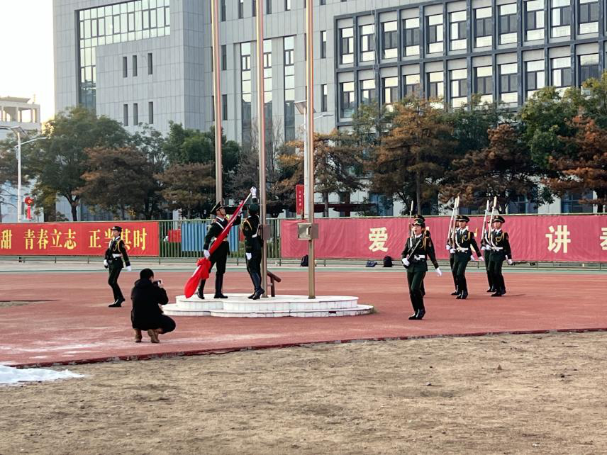 随着激昂的旋律响起,国旗护卫队迈着坚定有力的步伐,护送着鲜艳的五星红旗走向升旗台。在庄严的国歌声中,五星红旗缓缓升起,全体师生面向国旗肃立,行注目礼,奏唱国歌。