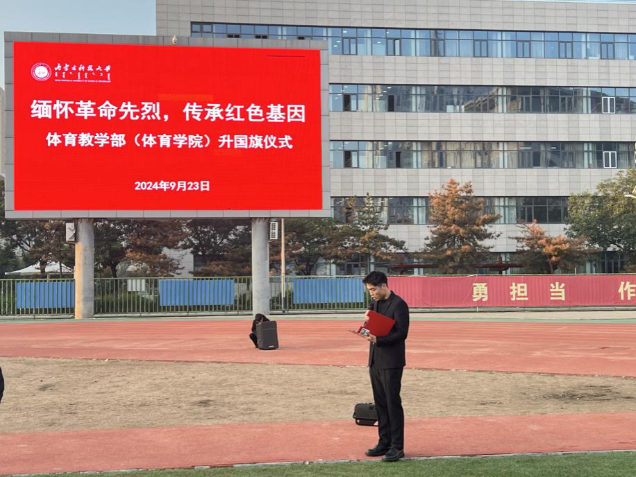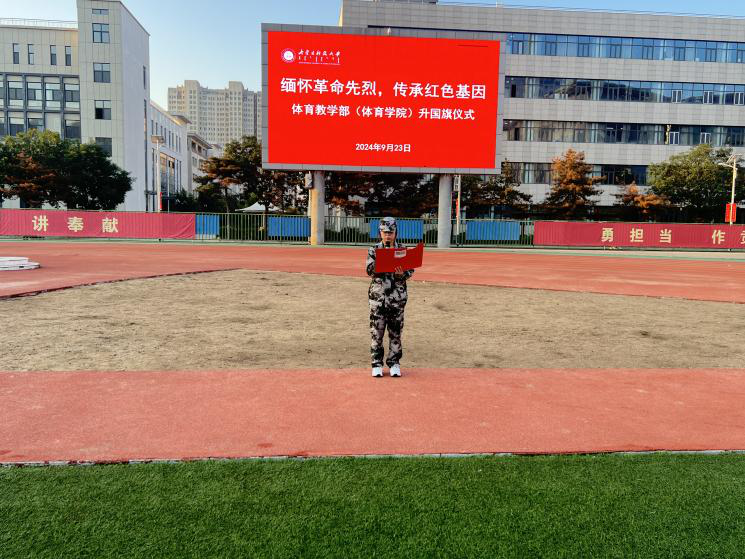 2024 年 9 月 23 日,伟德国际1946官方网举行“缅怀革命先烈,传承红色基因”升国旗仪式,学院党委书记韩冰、院长白楠、党委副书记唐国桥、副院长张新民、副院长杜晓炜、师生党员、体育教育专业全体学生参加升旗仪式。升旗仪式由体育教育2023-1班张翊主持。