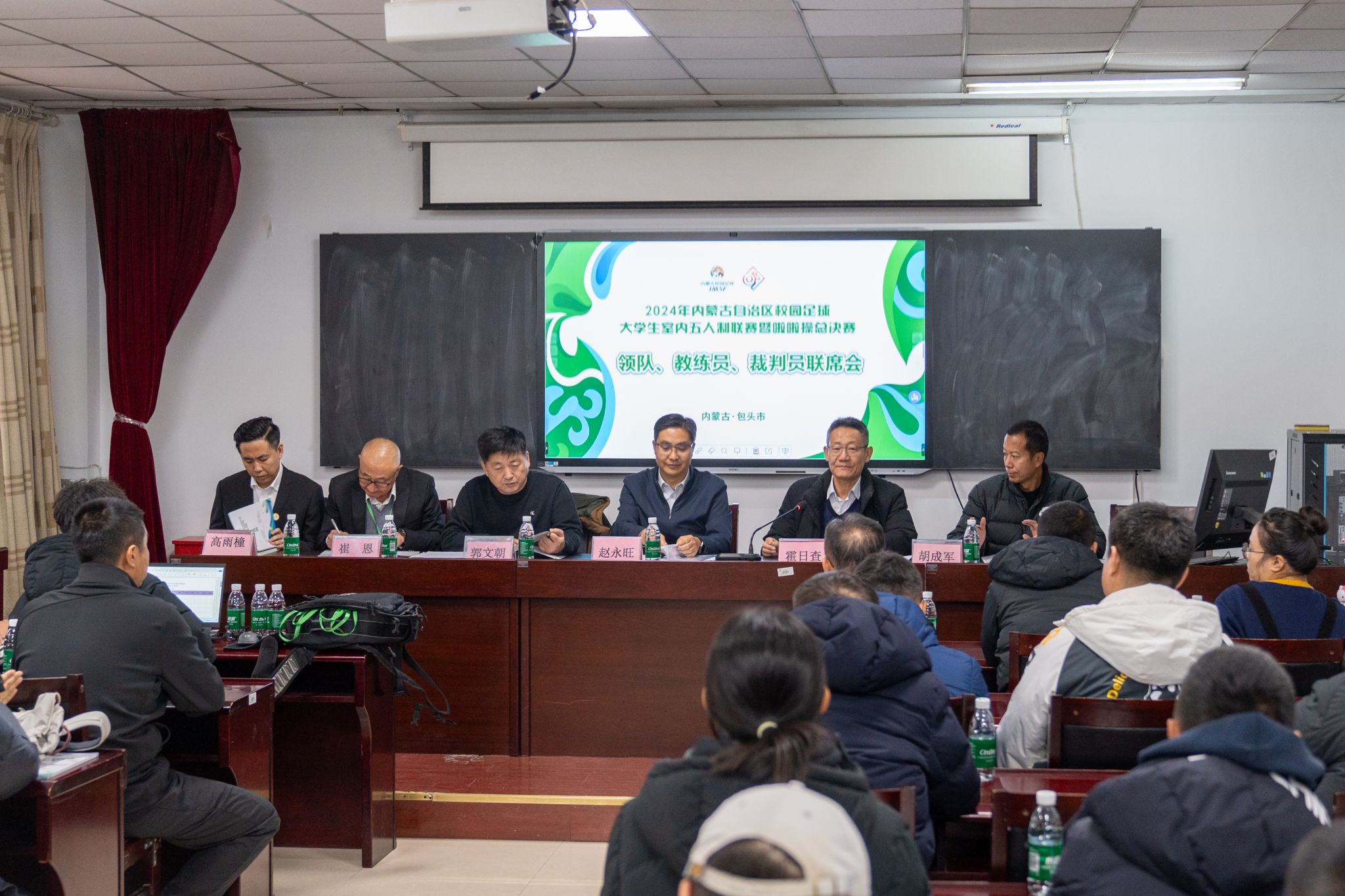 2024年11月25日,2024年内蒙古自治区校园足球大学生室内五人制联赛暨啦啦操总决赛赛前联席会在伟德国际1946官方网体育馆召开。伟德国际1946官方网党委委员、副校长赵永旺,自治区教育厅体育卫生与劳动教育处副处长郭文朝,内蒙古学生体育协会会长霍日查,内蒙古学生体育协会副会长赵生宝,室内五人制足球比赛监督崔恩,室内五人制足球比赛裁判长胡成军,啦啦操比赛裁判长高雨橦,各参赛队伍领队、教练员参会,会议由霍日查主持。
