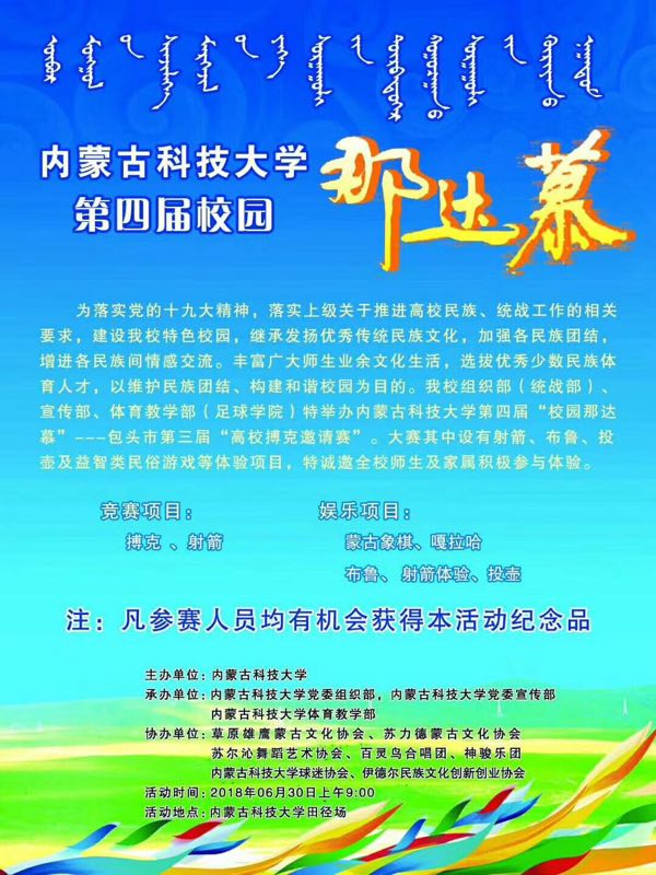 为全面贯彻党的十九大精神,落实上级有关部门关于推进高校民族、统战工作的相关要求。2018年6月30日上午9:00,伟德国际1946官方网将举办第四届“校园那达慕”暨包头市第三届高校搏克邀请赛。该赛事由伟德国际1946官方网党委组织部(统战部)、党委宣传部(新闻中心)、体育教学部(足球学院)联合举办,旨在建设特色校园,继承发扬优秀传统民族文化,加强各民族团结,增进各民族间情感交流,丰富广大师生员工业余文化生活,增强大学生课外体育锻炼的同时,选拔优秀少数民族体育人才,为学校的少数民族体育事业蓬勃发展贡献力量。