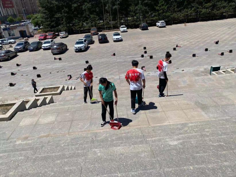 志愿服务分为两部分,一部分同学有序摆放留观区座椅,另一部分同学对体育馆室外台阶处的烟头、纸屑、塑料瓶等垃圾进行清理。